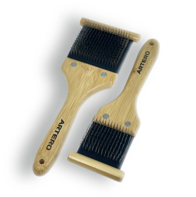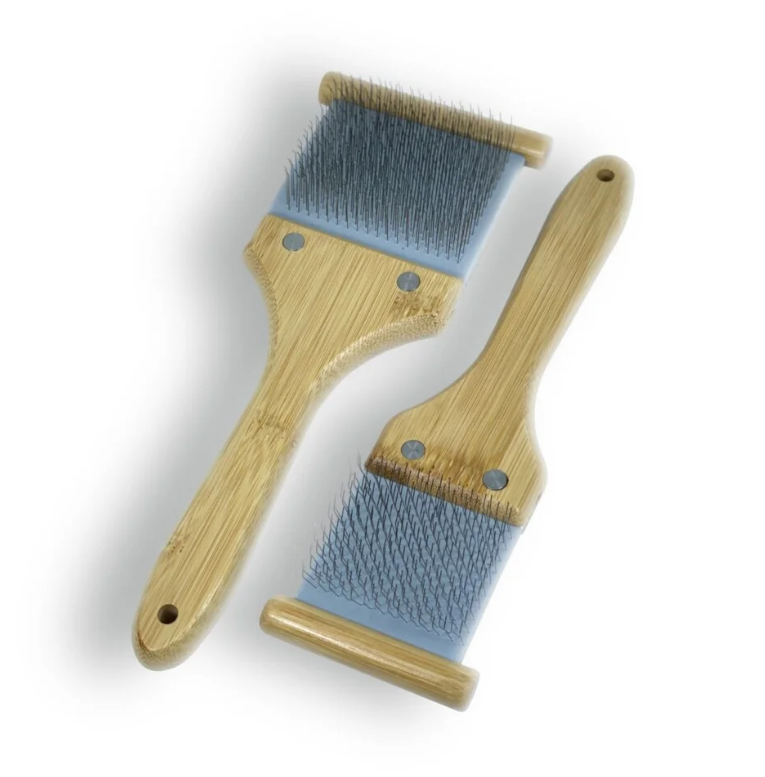 L’une des faces est de couleur grise et présente des picots fins positionnés de manière aléatoire. Son utilisation est parfaite pour ouvrir le pelage et étirer les poils. L’autre face de la carde est noire et comporte des picots épais disposés en ligne, qui permettent de démêler les poils.